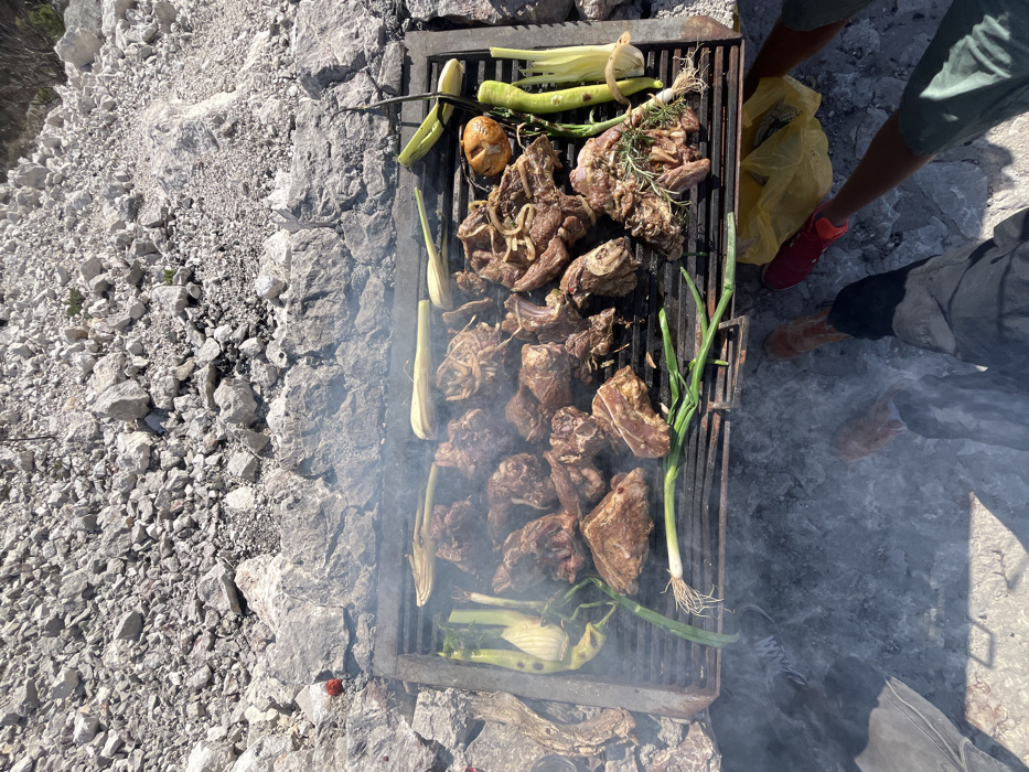 An overhead view captures a metal grill laden with various cuts of meat and vegetables cooking over coals, emitting smoke. The scene is set on a rocky, uneven terrain composed of light gray to white stones and gravel, indicative of an outdoor, possibly mountainous or quarry-like environment in Stanišići, Montenegro. On the grill, numerous pieces of bone-in meat, likely lamb or goat, are arranged, exhibiting various stages of browning. These are interspersed with whole and sliced vegetables, including several stalks of fennel, multiple green spring onions or similar long-stemmed vegetables, and a single whole onion, which appears partially charred. Some meat cuts are seasoned with fresh herbs, specifically rosemary. Below the grill, visible at the bottom of the frame, are the lower legs and feet of at least three individuals standing on the rocky ground. One person wears light brown shoes and dark pants, another wears red athletic shoes, and a yellow plastic bag rests near their feet. A third person's legs, clad in dark pants, are partially visible to the left. The ground immediately beneath and around the grill is darkened with ash. A small red object, possibly a berry or fruit, is visible on the rocky ground to the left of the grill. The lighting suggests a bright, sunny outdoor setting.