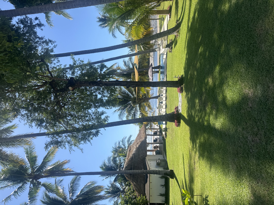 Lush green lawn stretches through a tropical scene