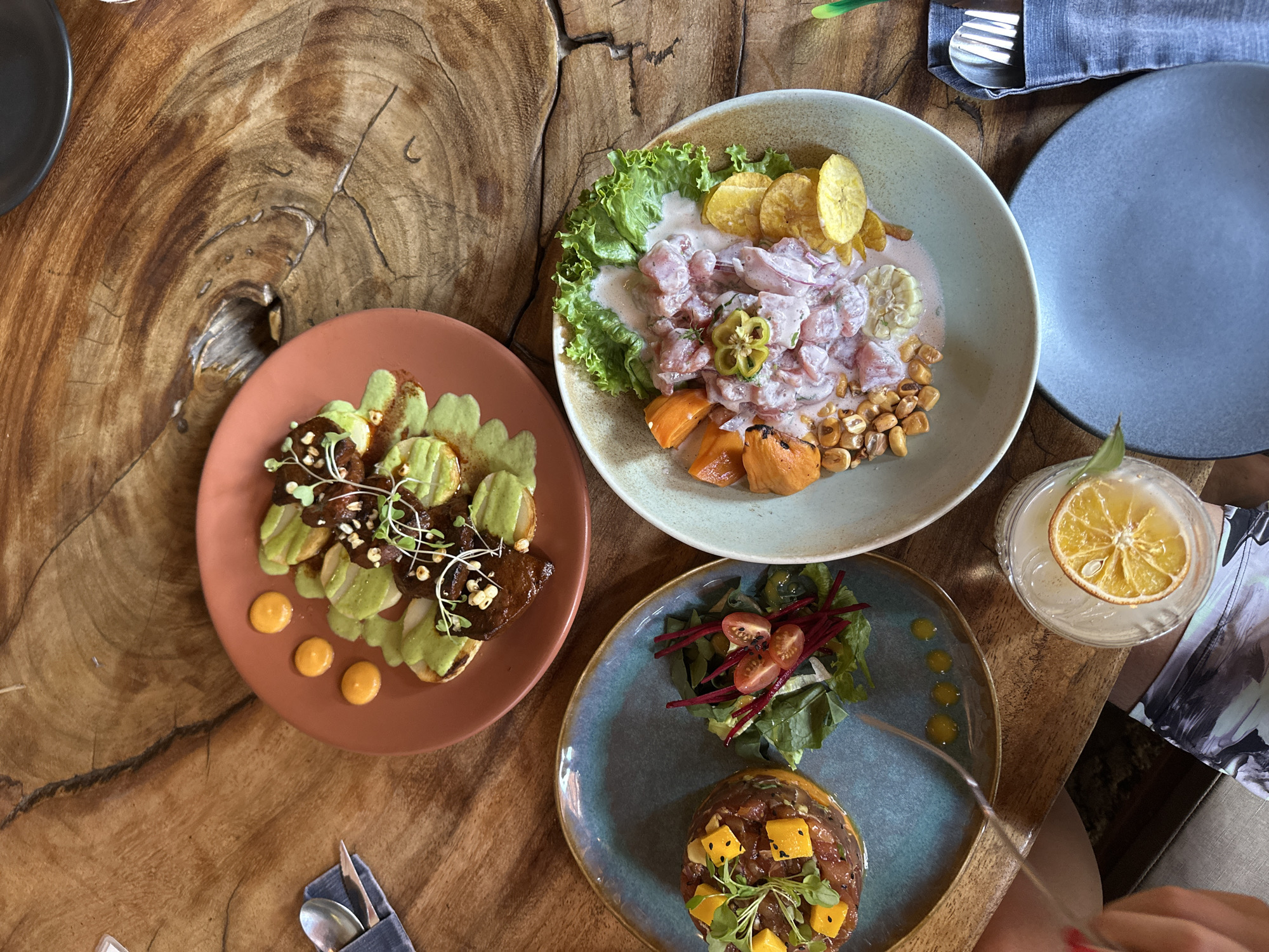 The image depicts a table setting with four plates of food and a cocktail glass, suggesting a meal in progress. The table is made of a light brown wood with prominent grain patterns. The food items appear to be small plates or appetizers. The dish on the upper right is ceviche, featuring diced fish marinated in citrus juice, garnished with lettuce, fried plantains, sweet potato and corn. The dish on the left is composed of sliced vegetables, mole, and sprouts on some type of toasted bread. The plate at the bottom center contains a raw fish appetizer with greens and sliced beet. The cocktail glass contains an orange slice as garnish. Silverware is visible near the plates. The scene may be set outdoors on a restaurant patio in Brisas de Zicatela, Mexico.