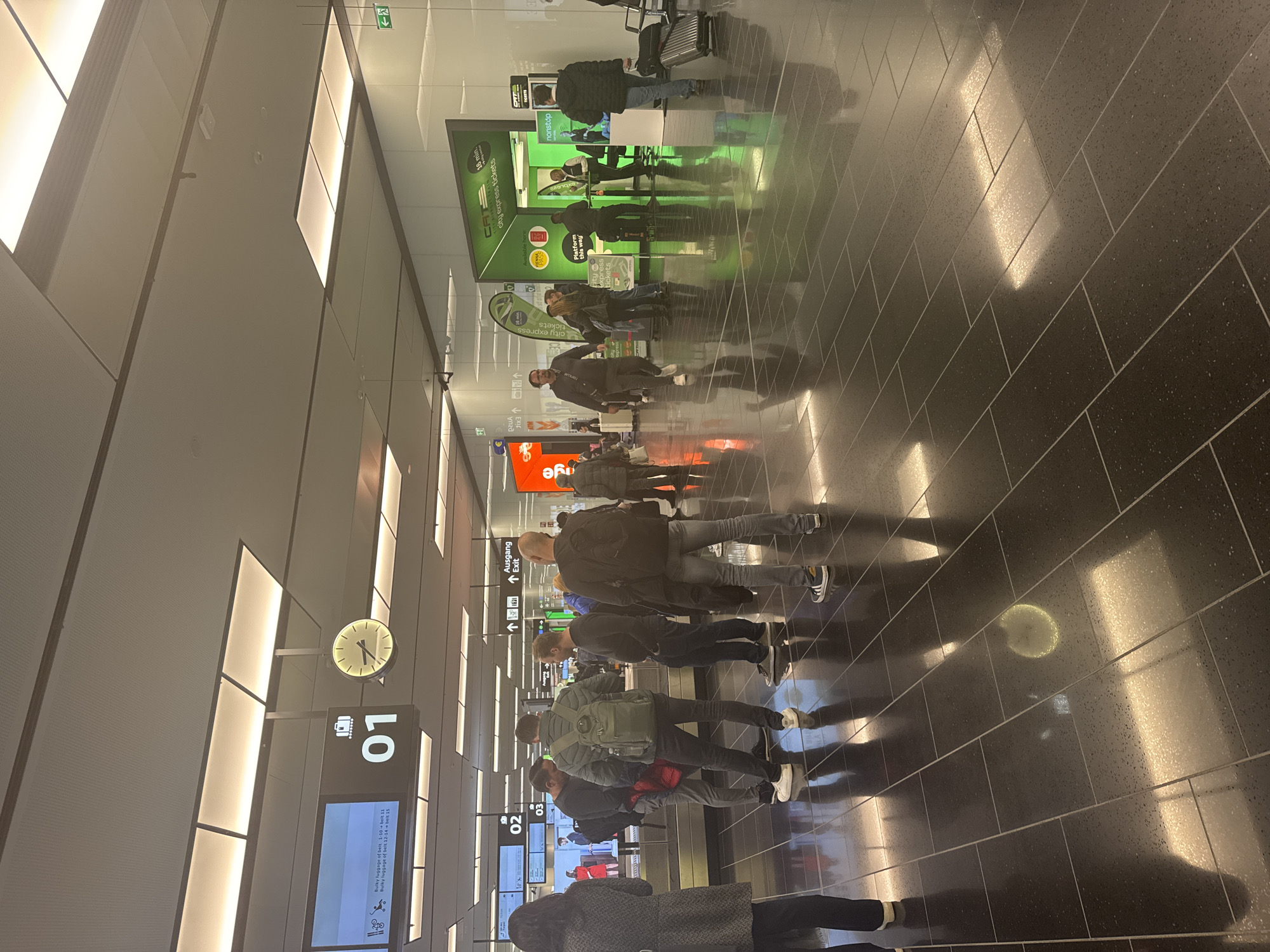 The image depicts an indoor scene within the baggage claim area of Vienna International Airport (Flughafen Wien-Schwechat) in Schwechat, Austria. The environment features a highly polished dark grey or black tiled floor, reflecting overhead rectangular ceiling light panels. The ceiling is a suspended grid system with these integrated light fixtures. Prominent overhead signage indicates "01" with a baggage icon, a digital screen displaying "Bulky luggage of belt 1-10 + belt 11" and "Bulky luggage of belt 12-14 + belt 15", and an analog clock showing approximately 12:45. Partially visible signs for baggage belts "02" and "03" are also present. Green "Ausgang Exit" signs with directional arrows are mounted overhead. On the right, a large, green-branded kiosk for "CAT City Express tickets" is visible, advertising a "16 min." travel time, with multiple individuals near it. Another kiosk, partially obscured, has "nonstop" branding. Approximately 20-25 individuals are visible within the frame. Most are adults, casually dressed. A group of four men stands near baggage belts "02" and "03" on the left, one wearing a green backpack. Another man in the mid-right is pulling a silver rolling suitcase. Individuals are either standing, walking, or interacting with the ticket kiosks. A woman in a dark grey coat is in the left foreground, partially obscuring the view of the baggage belts. No overt interactions or specific actions beyond movement and waiting are discernible. Luggage includes backpacks and rolling suitcases. The scene is brightly illuminated by artificial overhead lighting.