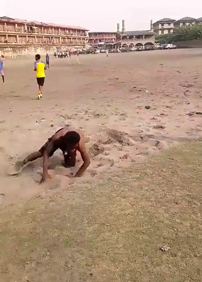 young man performing a backflip on a sandy and grassy field. He lands the flip in the sand, appearing to struggle to get up. The background includes other people playing soccer or watching, a building, and some vehicles. The video then cuts to a group of shirtless young men standing on the grassy area of the field, possibly discussing the flip.