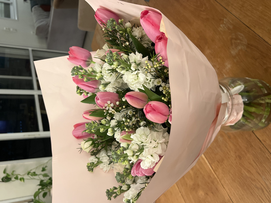 - "A bouquet of pink tulips and white stock flowers are wrapped in light pink paper" by FM-3hXJP2, licensed under CC BY 4.0