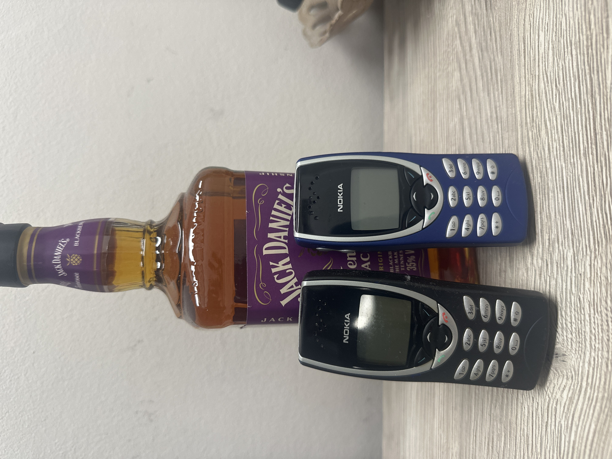 bottle of Jack Daniel's whiskey placed horizontally on a light-colored, possibly wooden, surface. Two Nokia 3310 mobile phones are also present, one blue and one black, positioned next to the bottle. The phones and bottle are closely arranged, suggesting a deliberate composition. The background is a plain, light-colored wall. The lighting appears to be neutral, and the overall scene is simple and uncluttered. There is no evidence to suggest that this image was taken in Munich, Germany.