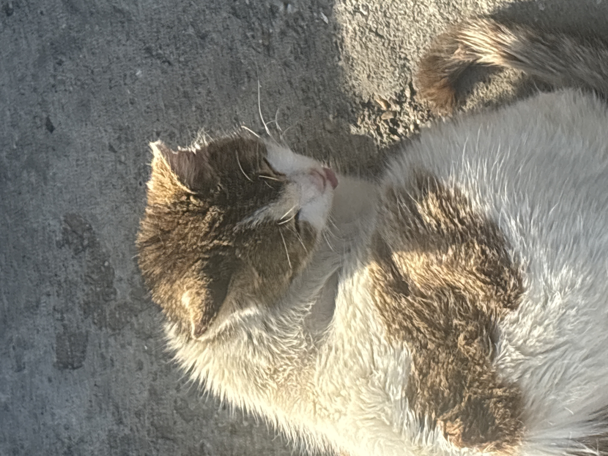 A medium-sized, short-haired cat lies on a concrete surface. The cat is predominantly white with brown patches. The cat is lying on its side with its head tilted back, mouth slightly open and pink tongue barely sticking out. The cat's eyes are closed. The cat's whiskers are visible. The ground appears to be sunlit. The location in Gorna Oryahovitsa, Bulgaria is not discernible.
