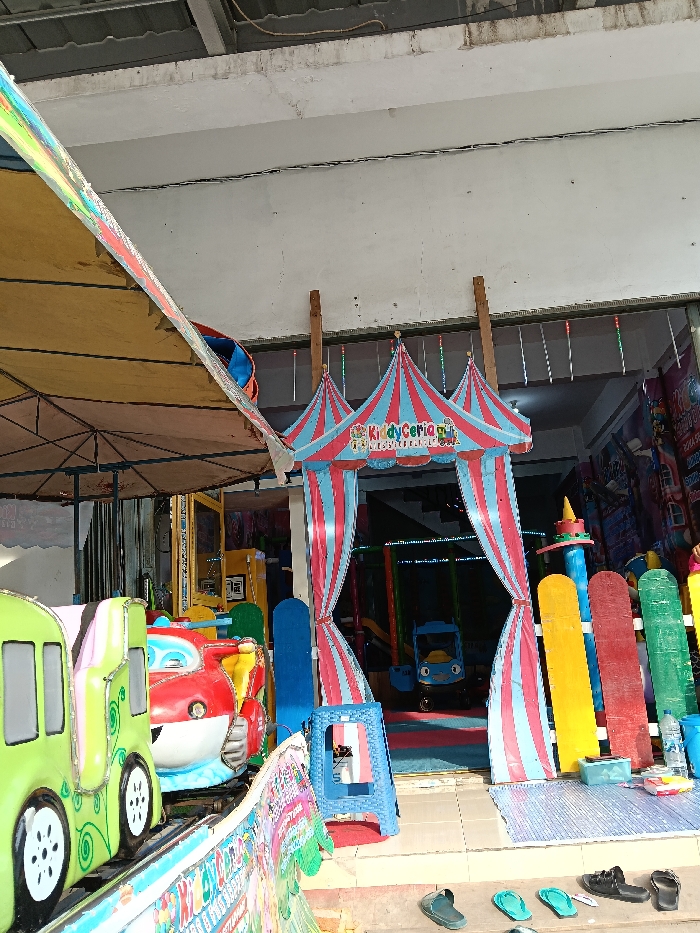 The image depicts the entrance to a children's play area, identified as "KiddyCeria," in Pamotan, Indonesia