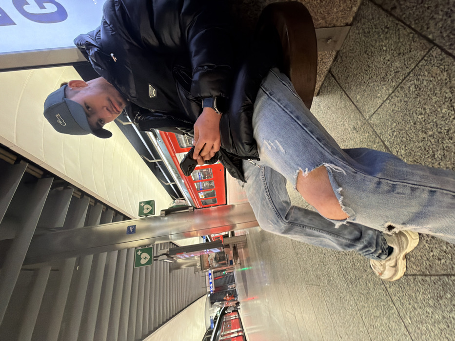 A young man in a black puffer jacket, ripped jeans, and a baseball cap is sitting on a stool in what appears to be a subway station