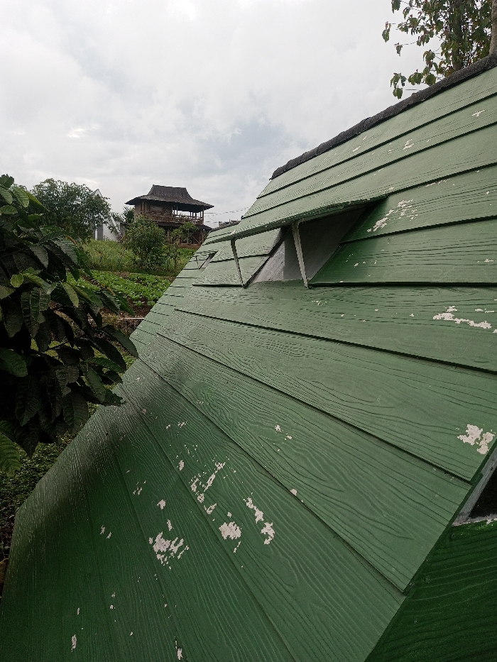 The image displays an outdoor scene in Abbireddygudem, India, under an overcast sky. The foreground is dominated by a steeply angled, dark green structure, likely a roof or wall, clad with wood-grain textured panels. This surface exhibits extensive wear, with numerous patches of peeled lighter-colored material. Two open, triangular vents are present along its upper edge. To the left, dark green foliage from a bush or tree is partially visible. In the midground, a gently sloping terrain covered in green vegetation, possibly a cultivated field, is visible. The background features a multi-story building with a distinctive, dark, multi-tiered traditional roof and an open balcony, positioned on a higher elevation. A second, lighter-colored building with a sloped roof is partially discernible to the left of the primary background structure. No individuals are present, and no actions or interactions are depicted.