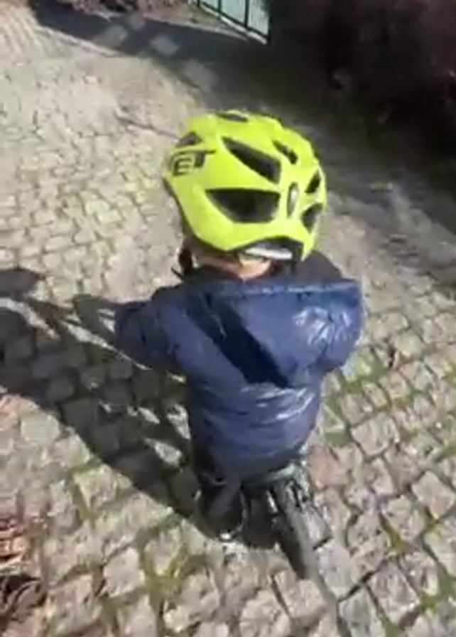 - "A child wearing a shiny navy blue jacket and a neon yellow MET bike helmet is riding a small black bicycle on a cobblestone surface" by FM-z4cUR2, licensed under CC BY 4.0