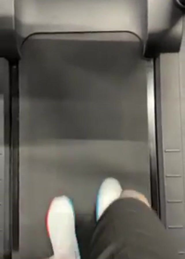 person walking on a treadmill at a gym. The treadmill is black and gray and has a digital display showing time, speed, and other information. The person is wearing white athletic shoes with red and blue accents and black shorts. The camera is positioned to show the person's feet and legs as they walk on the treadmill. As the camera is rotated, additional treadmills can be seen along with other people using them in the background. There is a bottle of water on the treadmill console. The gym appears to be brightly lit.
