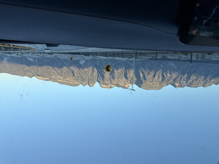 A landscape viewed from a car shows a highway with yellow guardrails and signage leading to mountains. The mountains are illuminated by the sun, casting shadows. The sky is clear and blue. The interior of the car is visible at the top of the frame, including a screen. The image appears to be taken through the windshield.