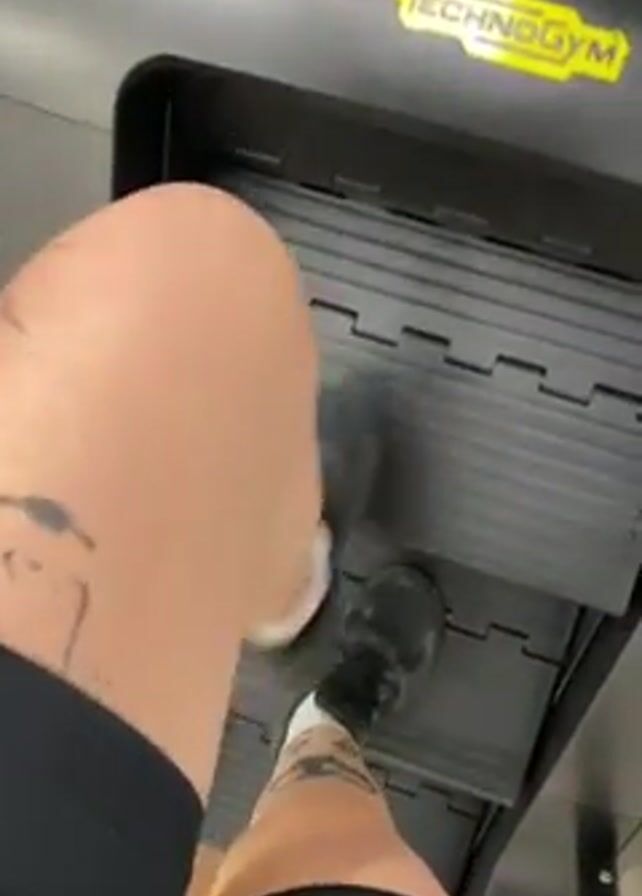 The camera, positioned above and facing downward, shows a person using a Technogym stair-climbing machine