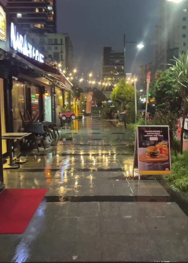 city street scene at night after rain. The pavement is wet and reflects the lights from the buildings and streetlights, creating a shimmering effect. On the left, there's a cafe or restaurant with outdoor seating where the chairs are stacked. A red carpet is at the entrance. On the right, there is a sandwich board advertising burgers and fries. In the distance, a person can be seen walking along the path. Buildings line both sides of the street. The overall mood is quiet and somewhat subdued due to the rain.