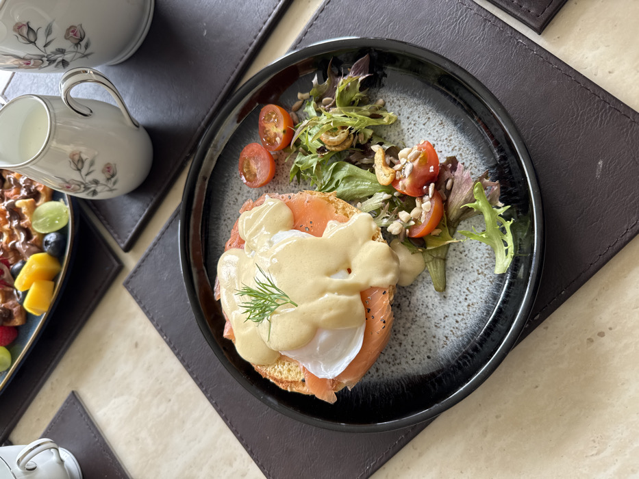 The image displays a breakfast or brunch table setup on a light-colored, possibly marble, surface