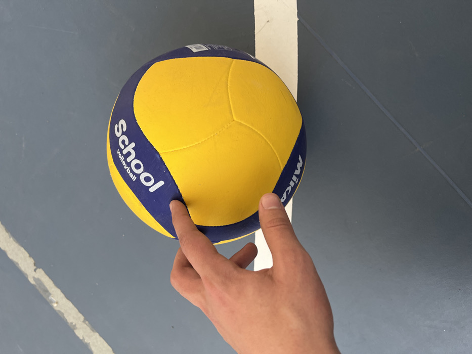 - "An image taken in Dolni Chiflik, Bulgaria, depicts a close-up, top-down view of a person's left hand interacting with a volleyball on a dark grey sports court" by FM-fdq7Z2, licensed under CC BY 4.0
