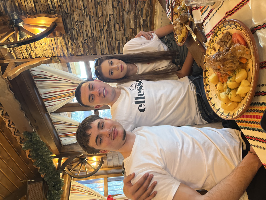 Three young adults are seated at a wooden table in a traditional restaurant setting within Samokov, Bulgaria