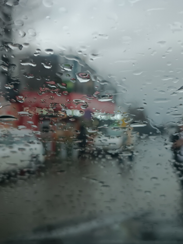 - "The image depicts a blurred street scene in Tbilisi, Georgia, viewed through a transparent surface heavily covered with raindrops, indicative of current precipitation" by FM-QyAS32, licensed under CC BY 4.0