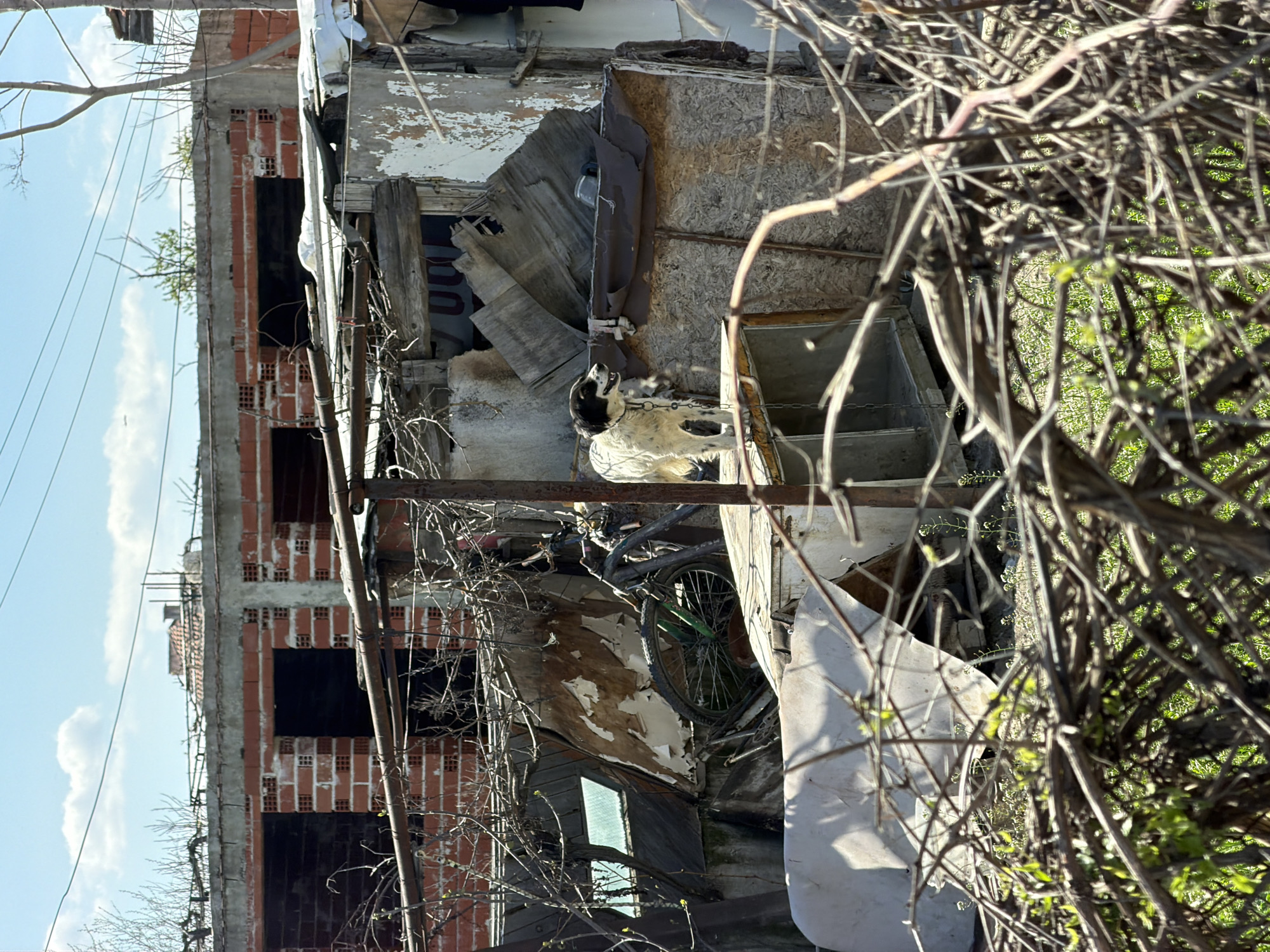 dilapidated structure in Stamboliyski, Bulgaria. The building appears unfinished or abandoned, with exposed brick walls and gaping window openings. Debris and overgrown vegetation surround the structure. A dog on a chain is near the building. A bicycle is visible amongst the debris. The sky is visible in the background.