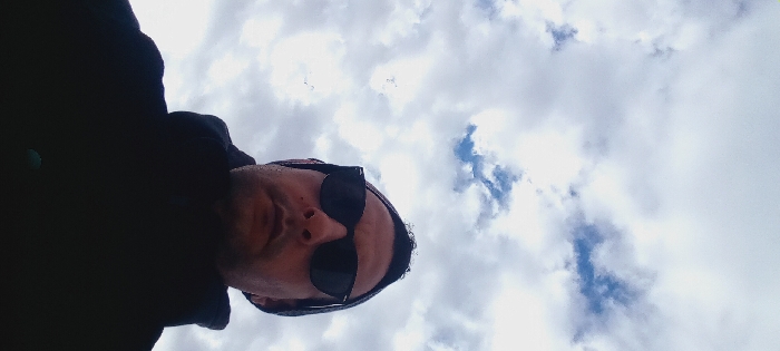 The specific location within Meknes, Morocco, cannot be determined from the visual evidence provided. The scene is an upward-angled portrait featuring a single adult male subject against a cloudy sky. The male is positioned in the lower half of the frame, viewed from the chest upwards. He wears a dark beanie on his head and dark, square-framed sunglasses that obscure his eyes. His nose, mouth, and chin are visible. He is dressed in a dark, possibly black, hooded jacket with a high collar. Dark, curly hair is visible beneath the beanie. The background consists of an overcast sky with numerous white and grey cumulus clouds, interspersed with visible patches of blue sky, particularly in the upper central and right areas of the image. The subject appears stationary, looking generally forward or slightly upwards relative to the low camera angle. No other individuals, objects, or interactions are present in the foreground or midground.