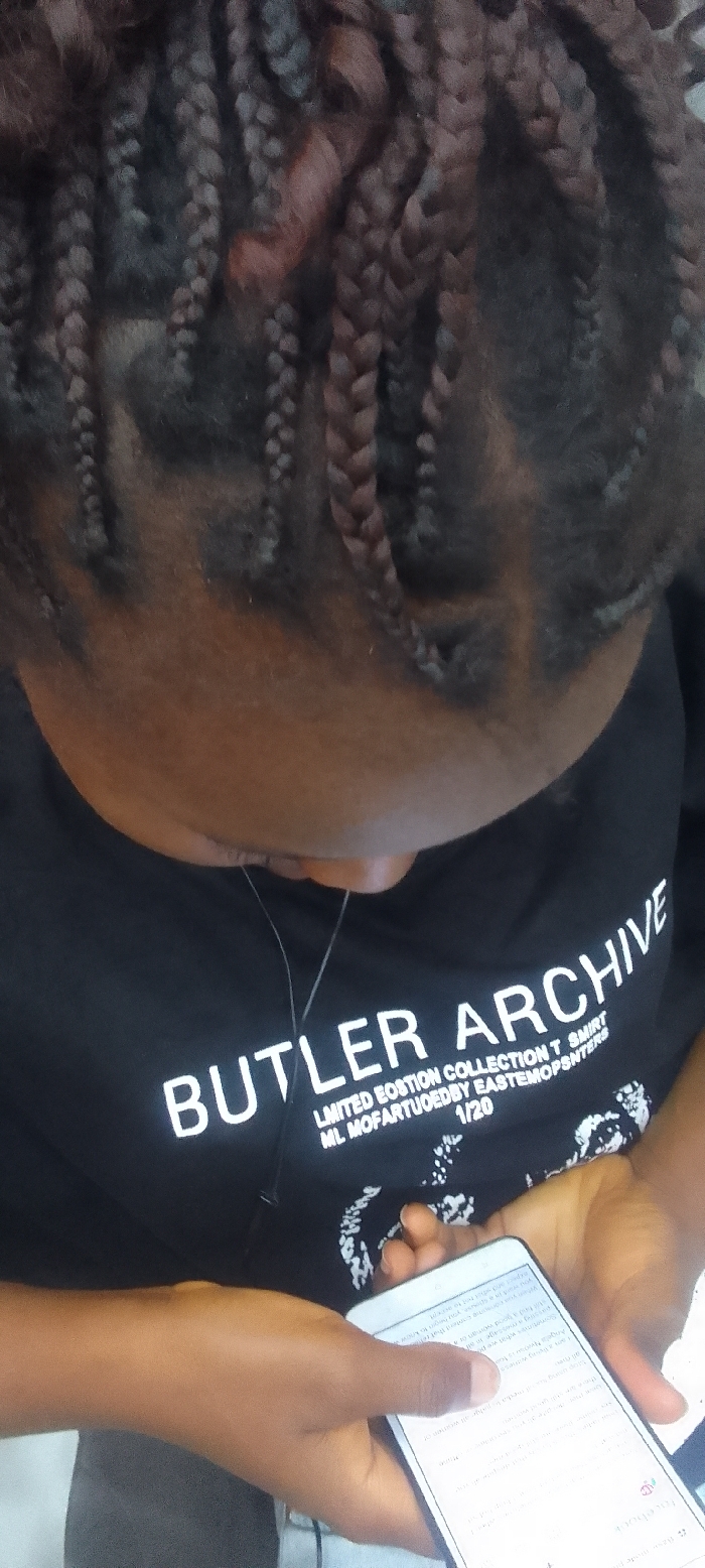 An individual is depicted in Sabon Tasha, Nigeria, viewed from a high angle. The person has dark skin and their hair is styled in numerous small, dark braids, some exhibiting a reddish-brown tint. They are wearing a black t-shirt with "BUTLER ARCHIVE" prominently printed in white capital letters. Below this, smaller white text reads, "LIMITED BOSTION COLLECTION T SHIRT ML MOFARTUOEDBY EASTEMOPSNTERS 1/20". Both hands hold a white smartphone horizontally, with thumbs positioned to interact with the illuminated screen, which displays text consistent with a social media interface. A thin white wire, likely an earphone cable, hangs from the upper torso towards the phone. The background is out of focus and indistinct.