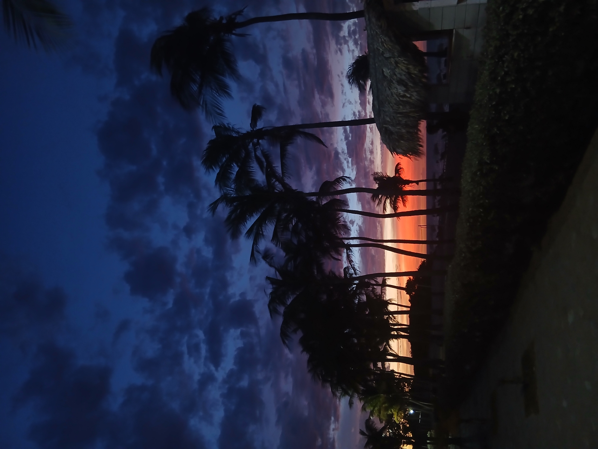 A nighttime, rotated, long-exposure landscape shot reveals a row of silhouetted palm trees along a shoreline at dusk. The sky exhibits a gradient, transitioning from a deep blue in the upper left to orange and pink hues on the horizon, with textured clouds spanning the color spectrum. A thatched-roof structure and a hedge are located on the right side. The bottom right foreground exhibits pavement or a similar surface, and lights are visible in the lower right corner. The location is unknown.