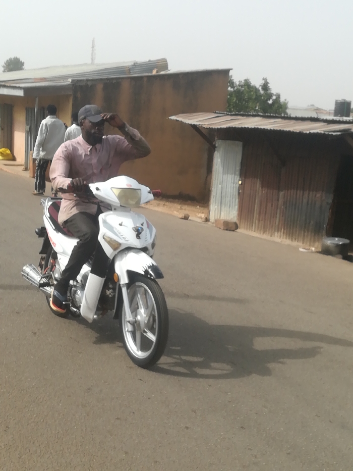 A man wearing a cap and pink shirt rides a white motorcycle on a paved road. The man is looking to the side, and his right hand is raised to his forehead, possibly shielding his eyes. Buildings of various construction types line the road, including a corrugated metal structure. The scene is captured in daylight, with shadows cast on the road, indicating a sunny day. Two people are walking on the road further away.