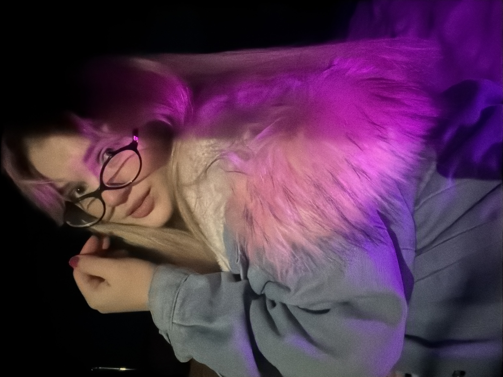 A blonde woman with glasses and a furry collar poses in a low-light environment. She is wearing a light blue sweatshirt. The location is not evident in the image.