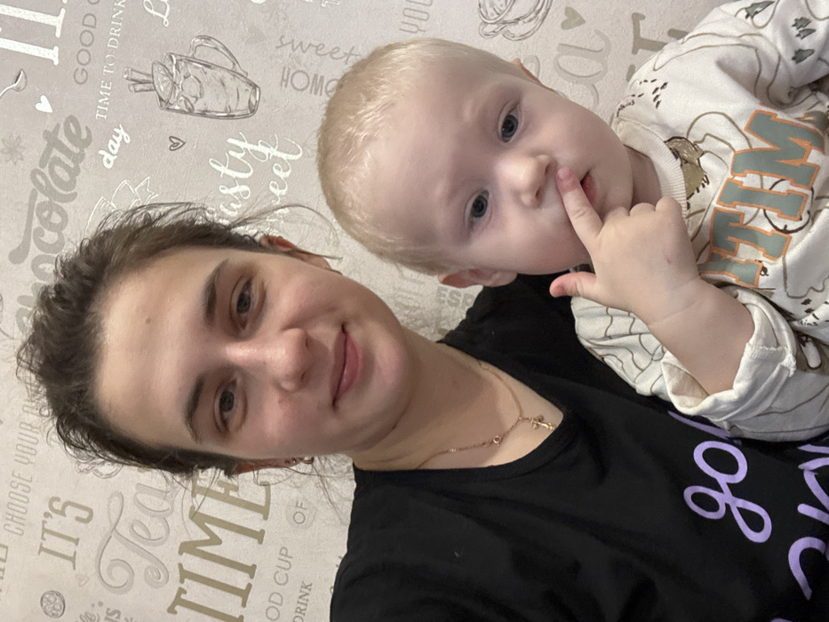 This image depicts two individuals, an adult female and a young child, positioned for a close-up photograph in an indoor setting. The location is Chaikovsky, Russia. The female, appearing to be in her twenties or thirties, is situated on the left, looking directly at the camera with a slight smile. She has dark hair pulled back from her face, fair skin, and small stud earrings in both ears. She wears a black v-neck shirt, and a thin gold chain necklace with a small cross pendant is visible. To her right is a young child, likely a toddler, with light blonde hair and blue eyes, also looking towards the camera. The child's right index finger is pressed against the area below their nose and above their upper lip. The child wears a light-colored long-sleeved shirt patterned with various elements and partially visible text, including "ULTIM". The background is a light-colored wall covered in wallpaper featuring numerous stylized words and line drawings related to beverages and food, such as "CHOOSE your...", "IT'S Tea TIME", "chocolate", "tasty sweet", "GOOD CUP OF DRINK", "HOME", and "you". Illustrations include a mug with steam and a spoon, and a small heart. The lighting suggests an artificial indoor light source.