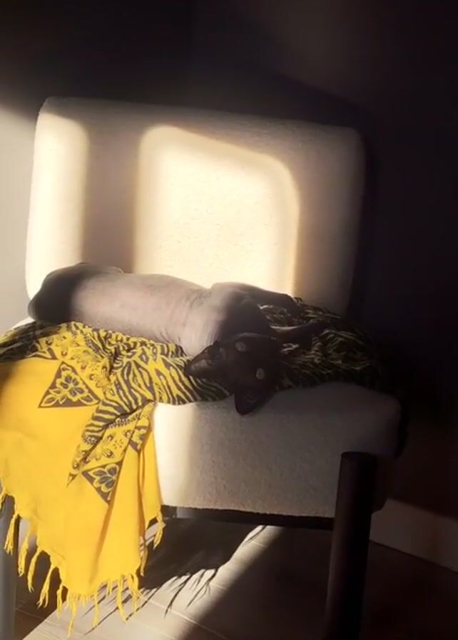 A hairless dog is lying on a white chair, on top of a yellow and black scarf. Sunlight is shining on the chair and dog. The room is dark.