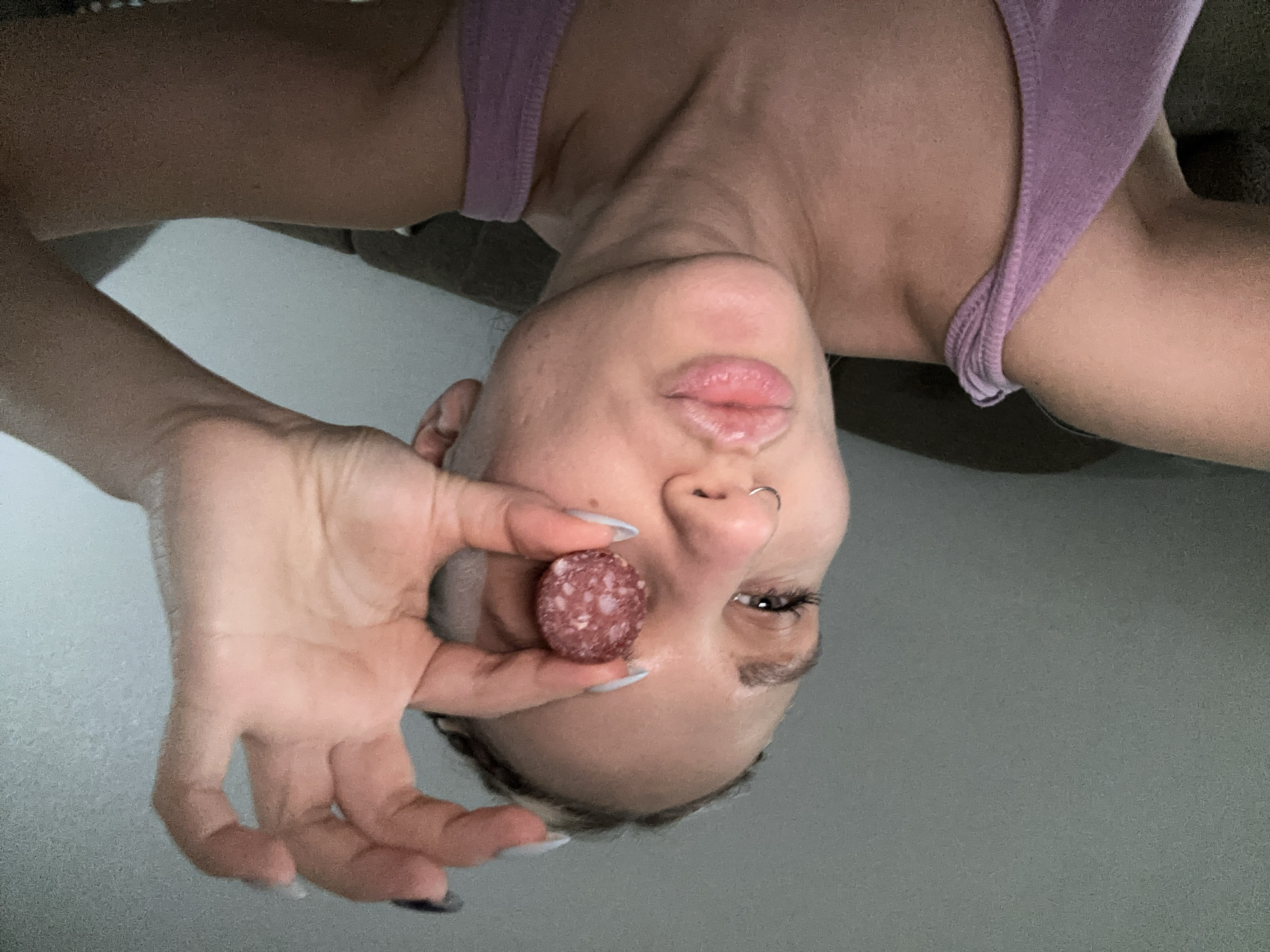 The image depicts a female subject in a close-up, head-and-shoulders indoor shot, located in Esenyurt, Turkey. The subject, a young adult female, has light skin, light eyebrows, and a small silver ring piercing her left nostril. Her fingernails are elongated, with light blue/grey tips visible on her right hand. She is wearing a light purple ribbed tank top. Her lips are puckered into a "kissing" expression, and she is looking directly at the camera. She holds a small, round, reddish-pink object, consistent with a piece of mini salami, between the thumb and index finger of her right hand. This object is positioned directly in front of her left eye, obscuring it. The background consists of a plain light grey wall, with a dark-colored, indistinct furniture item partially visible behind her right shoulder.