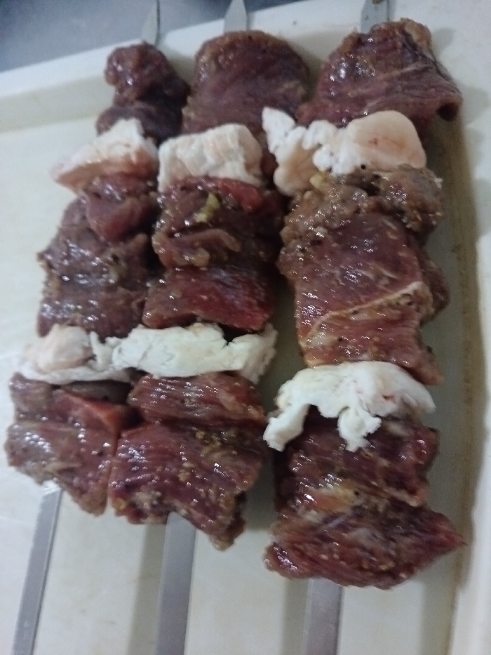 - "Three skewers of uncooked meat and fat alternate along their length" by FM-a8p7q1, licensed under CC BY 4.0