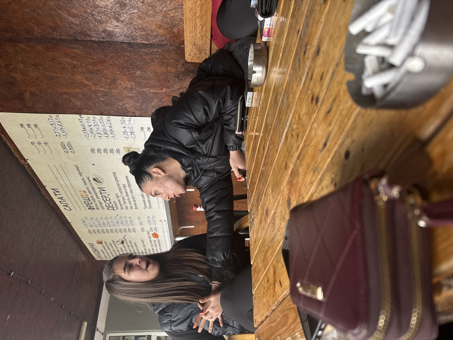 The image depicts two females seated at a wooden table in a casual eatery in Burgas, Bulgaria
