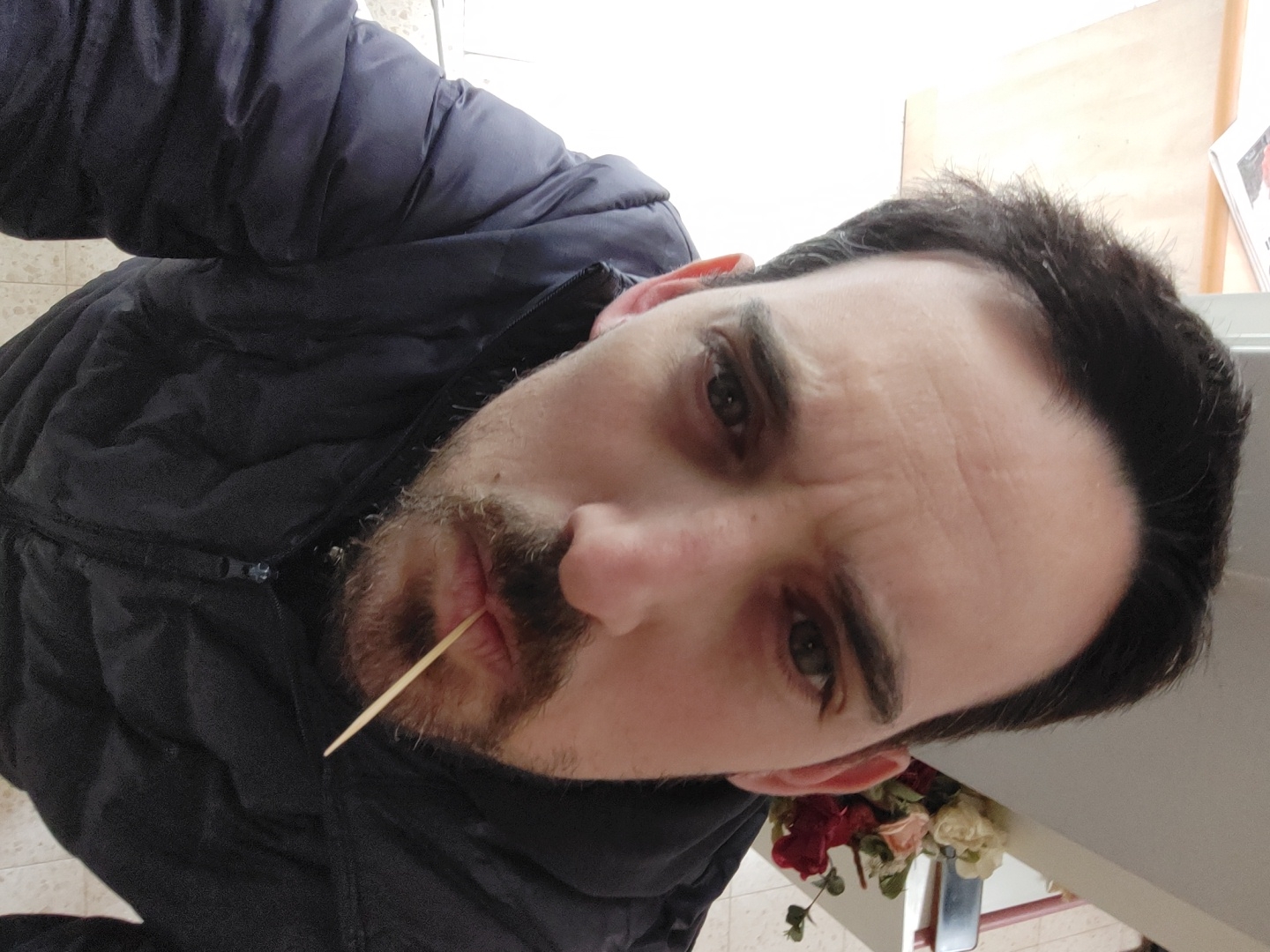 This image depicts an adult male in an indoor setting within Raanana, Israel. The subject, possessing dark hair, a dark mustache, and a beard, is centrally framed from a slightly low-angle perspective, looking directly into the camera. He is wearing a dark, likely navy or black, quilted puffer jacket with a visible zipper pull. A wooden toothpick is positioned horizontally in the center of his mouth, protruding outwards. The background on the left reveals a light-colored wall or surface, behind which a light-toned wooden or laminated surface holds a folded newspaper or magazine. On the right, a light vertical structure is visible, with a bouquet of artificial roses, primarily red, cream, and peach, positioned below it. The floor is light-colored and tiled. The scene is brightly illuminated.