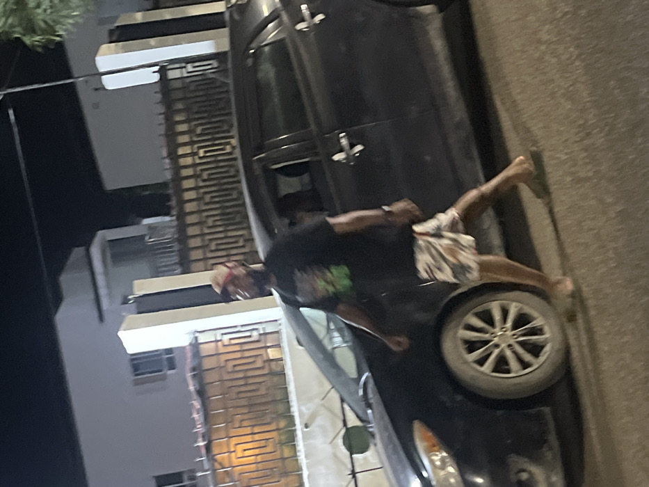 A person lies atop a parked, dark-colored car. The person wears a dark t-shirt and patterned shorts, with a light-colored head covering. The car is parked on a street next to a building with ornate metalwork and exterior lighting. The image appears to be taken at night.