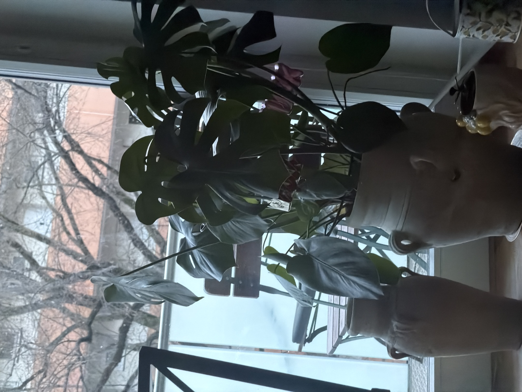 A view from inside a building features a window with a large monstera plant in a pot