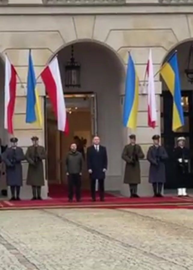 Two men, likely officials, stand on a red carpet in front of a grand building. The man on the left is wearing a military-style green jacket and dark pants. The man on the right is wearing a dark suit. They are flanked by uniformed guards holding rifles. Behind them, above the doorway, are Polish and Ukrainian flags displayed in pairs. A band plays in the background. The building appears to be a palace or official residence.
