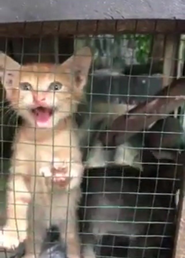 small, wire cage containing two kittens. One kitten is predominantly orange and stands at the front of the cage, vocalizing with its mouth open. The other kitten, which appears darker in color, is partially obscured behind the orange kitten. The cage has a wooden frame. The background shows some greenery, indicating an outdoor setting. The lighting suggests daylight.