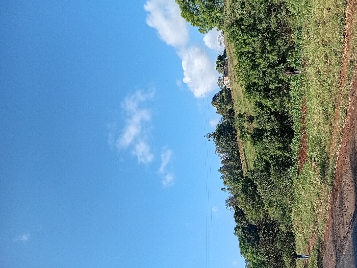 A vibrant blue sky with scattered clouds dominates the scene. Lush green vegetation covers the land, punctuated by a dirt road in the foreground. A few power lines stretch across the landscape. A building is visible in the distance amidst the greenery. The photo is taken at an angle, with the sky occupying a significant portion of the frame.