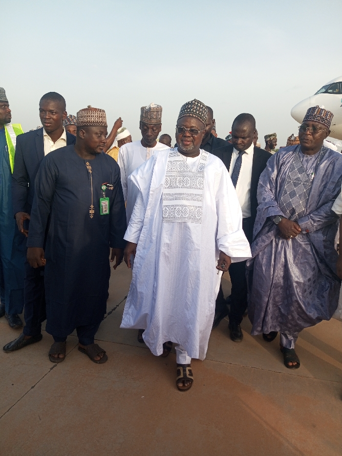 group of men standing on a tarmac, likely at an airport. The men are dressed in traditional Nigerian clothing, including long robes and hats. The man in the center of the image is wearing a white robe with a patterned design and a white cap. He appears to be the main focus of the image and is wearing glasses and a thick beard. Several other men stand around him, some with their arms crossed and some with hands in their pockets. The men are looking in different directions. The environment is a tarmac with a white airplane visible in the background. This scene is likely at the Amburse Airport in Amburse, Nigeria, which is located at the coordinates 12.485 latitude and 4.371 longitude.