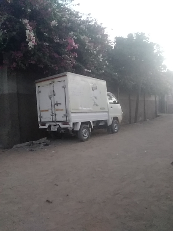 A white, small box truck, identified as a cargo or delivery vehicle, is stationary on an unpaved dirt road in Gwagwarwa, Nigeria