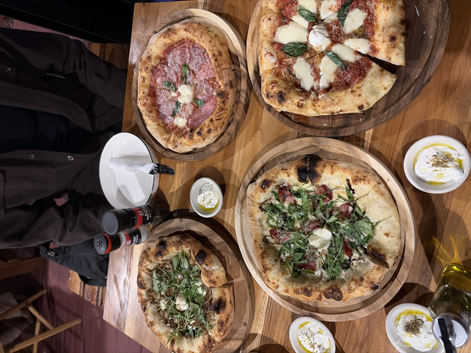 This image displays an indoor dining scene at a restaurant in Ban Tin That, Thailand. A light-colored wooden plank table serves as the primary surface for four individually prepared pizzas, each presented on a unique round wooden serving board. From the top-left, proceeding clockwise: 1. A round pizza features a robust, slightly charred crust, topped with dark caramelized ingredients, fresh arugula, and several white dollops, possibly of cheese or a creamy sauce. 2. A round pizza with a similarly charred crust is adorned with thinly sliced red cured meat (e.g., salami), small green basil leaves, and white dollops. 3. A roughly square-shaped pizza with a prominent, slightly irregular crust is covered in red tomato sauce, substantial pieces of fresh mozzarella cheese, and green basil leaves. One slice is partially separated from the main pie. 4. A roughly oval-shaped pizza, also with a dark-edged crust, is topped with cured meat (e.g., prosciutto), fresh arugula, and white dollops. Accompanying the pizzas are several ancillary items: * Two salt and pepper grinders are positioned between the top two pizzas, one labeled "McCormick Black Peppercorn." * An empty white ceramic plate containing a folded white napkin, a silver fork, and a knife is situated near the pepper grinder. * Four small white ceramic bowls, three visible in the foreground and one on the left, each contain a white substance (likely labneh or a soft cheese) drizzled with olive oil and sprinkled with a dry spice. * A clear glass bottle of olive oil with a pourer top is visible in the bottom-left corner. In the upper background, partially visible, a person is seated at the table, wearing a dark brown long-sleeved shirt or jacket, indicating their presence as a diner. The overall lighting is warm, suggesting an evening or intimate atmosphere.