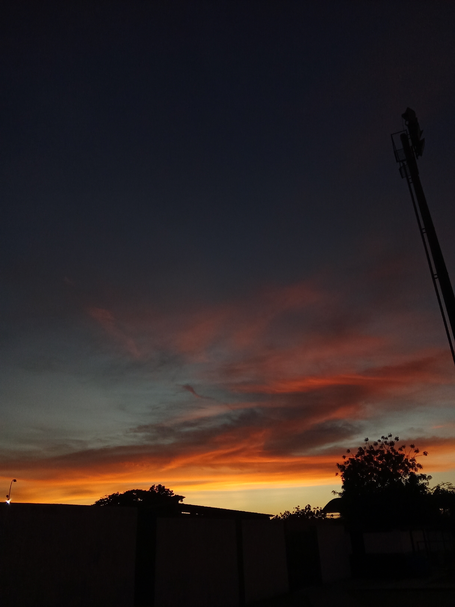 Captured at dusk, the photograph portrays a vivid sunset in Juan Griego, Venezuela. The sky transitions from a deep blue at the top to vibrant hues of orange and red closer to the horizon, painting long streaks across the cloud cover. In silhouette, a sparse arrangement of trees and a section of what appears to be a wall or the top of a building are visible. A tall antenna stands out against the sky on the right side of the image. A solitary street light is on the left. The composition focuses on the dramatic sunset, with the foreground elements appearing as dark shapes.