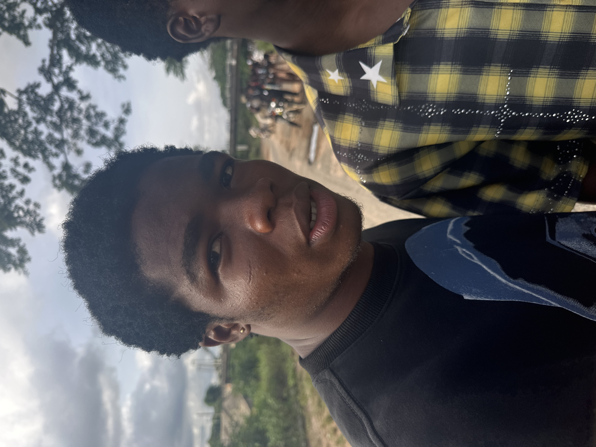 close-up selfie of two young men. The man in the foreground is wearing a black top and has short black hair. The other man, partially visible in the background, is wearing a yellow and black plaid shirt decorated with white stars and rhinestones. Behind them, the environment appears to be a somewhat urban or suburban outdoor setting. Based on the location, Ihiagwa, Nigeria, the background likely contains elements of the local landscape and architecture, though specific details are difficult to discern due to blur and focus on the subjects. There appear to be parked vehicles or motorcycles in the background.