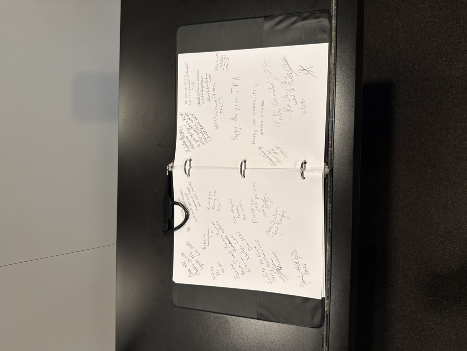 The image displays a guest book open to two pages, filled with handwritten messages and signatures. Many entries mention JFK (John F. Kennedy), and wish "Happy New Year" or "Merry Christmas," often followed by the year "2025". Signatures include names like "Andrea Aranda", "Rodriguez Family", "Eva Douglas", "Jena Hatt Jallo", and "Feliz Navidad JFK". Some entries express gratitude, such as "Thank you". Some entries include a date. It appears to be a guest book at the JFK memorial.