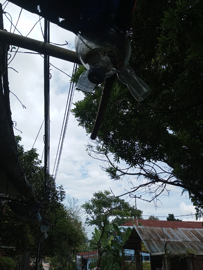 A modified plastic bottle hangs from a bamboo structure, possibly a homemade bird feeder. The bottle is attached to a pipe with plastic bags. Overhead wires run across a cloudy sky. Dense trees frame the scene. In the background, rooftops, foliage, and a hint of a village landscape are visible. The image appears to be taken from a low angle.