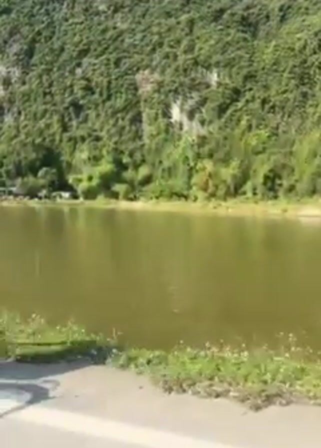 people riding bicycles along a road beside a lake