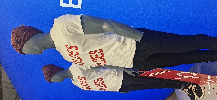 Two mannequins stand against a blue background. Each wears a maroon beanie, white t-shirt with the word "SOLDES" printed in red, black pants, and black shoes. A red sign with a white circle is positioned near the bottom mannequin, partially obscuring the shoes. The background is a bright, solid blue.