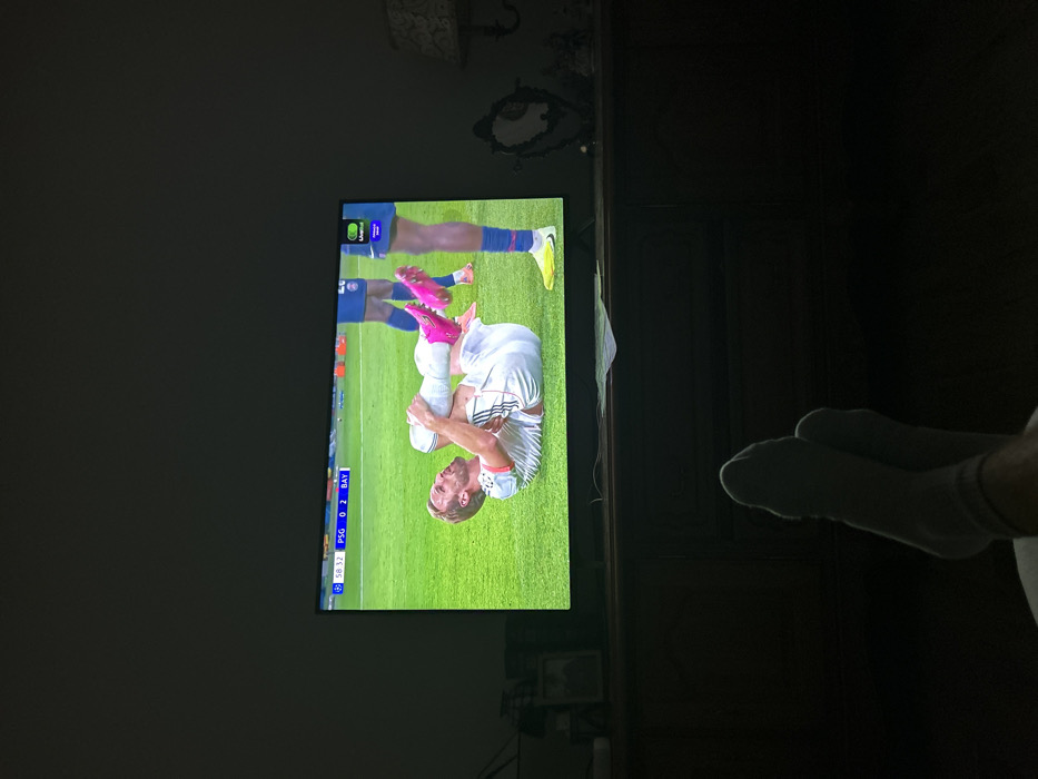 - "An interior scene in Strasbourg, France, depicts a dimly lit room where a person, whose feet are visible in light-colored socks resting in the foreground, is watching a football match on a television screen" by FM-C5pvp1, licensed under CC BY 4.0