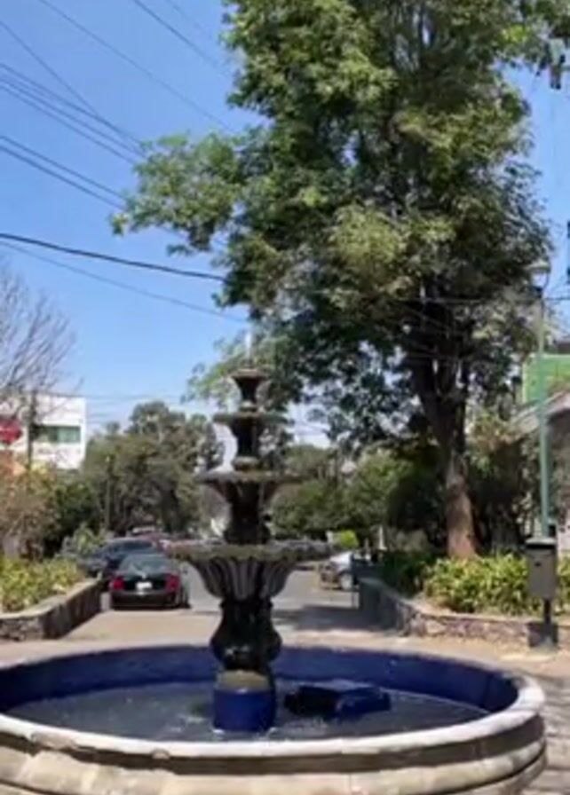 multi-tiered fountain in the center of a roundabout in a residential area. The fountain has a dark, ornate base and is surrounded by a circular basin filled with blue water. Water is flowing from the top tiers down to the lower ones. Behind the fountain is a street with cars driving on it. There are trees and bushes lining the street, and buildings are visible in the background. The sky is blue and clear. Power lines stretch across the top of the frame.