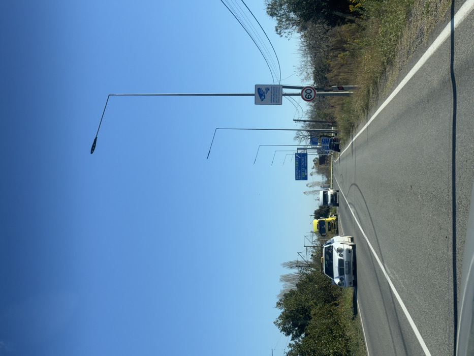 A street view shows a road with several vehicles driving on it. A white car is in the foreground. Road signs and light poles are on the side of the road. The sky is clear blue. Trees and vegetation line the road. The road surface is gray and shows tire marks.