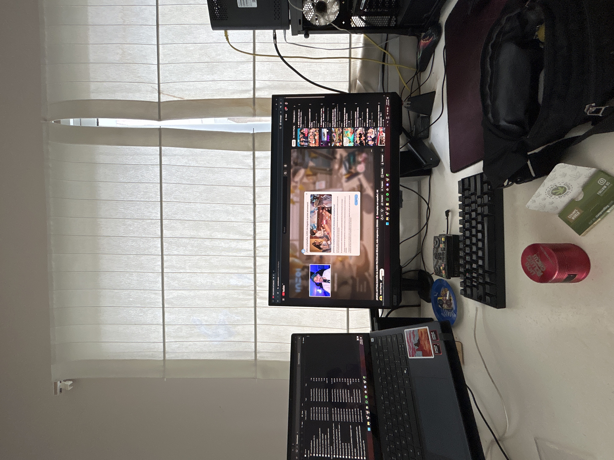 Here is a description of the image: The image shows a desk setup in front of a window with horizontal blinds. A desktop computer tower is visible at the top, along with a monitor displaying a YouTube page. Below the monitor is a laptop with its screen displaying file folders. To the right of the monitor are a mechanical keyboard, a small plastic figurine, a red cylindrical object labeled "Rolling Circus", a green and white box labeled "Stamps World", a black backpack, and a dark mousepad. The environment is a room with a neutral-colored wall behind the window.